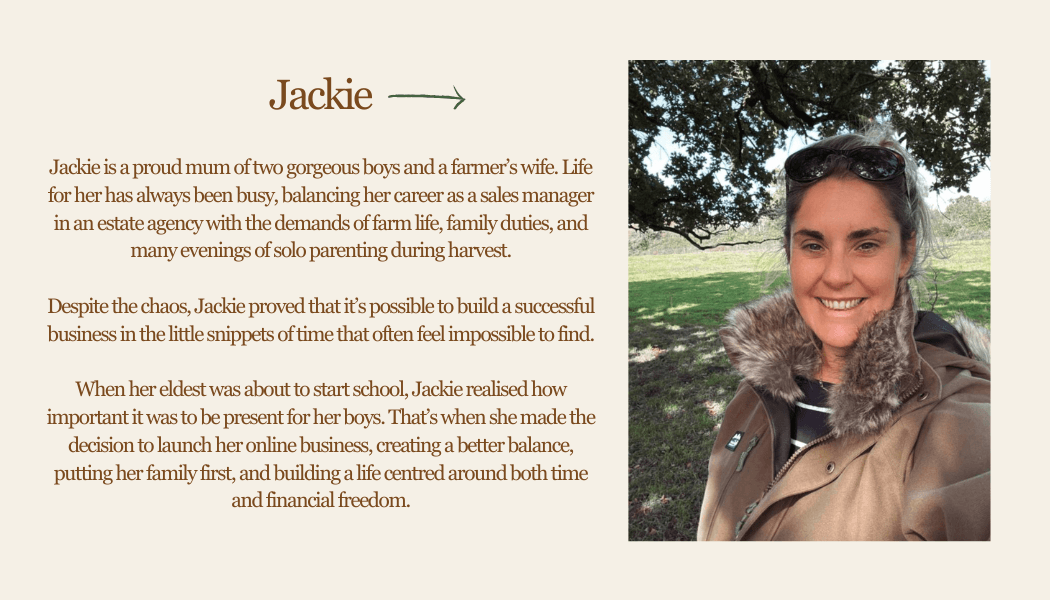 Since starting my journey, my greatest achievement has been making my maternity leave endless and consistently out-earning my former full-time salary! My business runs 24/7 thanks to the automation built into the model — whether I’m spending time with my little boy, riding my horses, walking the dogs, or simply enjoying life at a slower pace, on my terms.